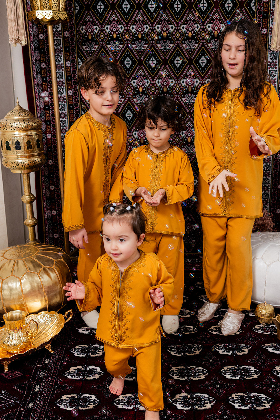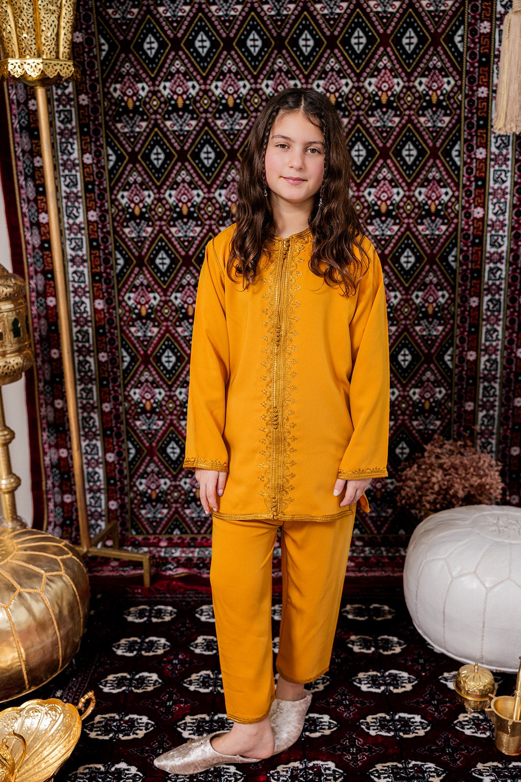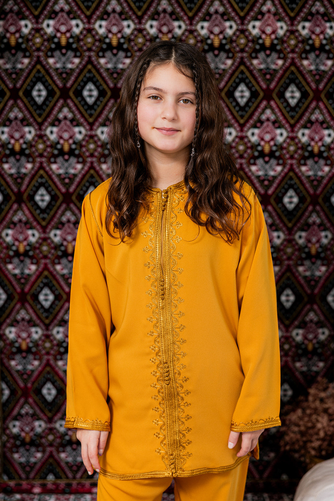 Deze warm mosterdgele stijlvolle jabador voor kinderen is een elegant tweedelig setje, geschikt voor zowel jongens als meisjes. De jabador bestaat uit een comfortabele broek en een tuniek met verfijnde afwerking.