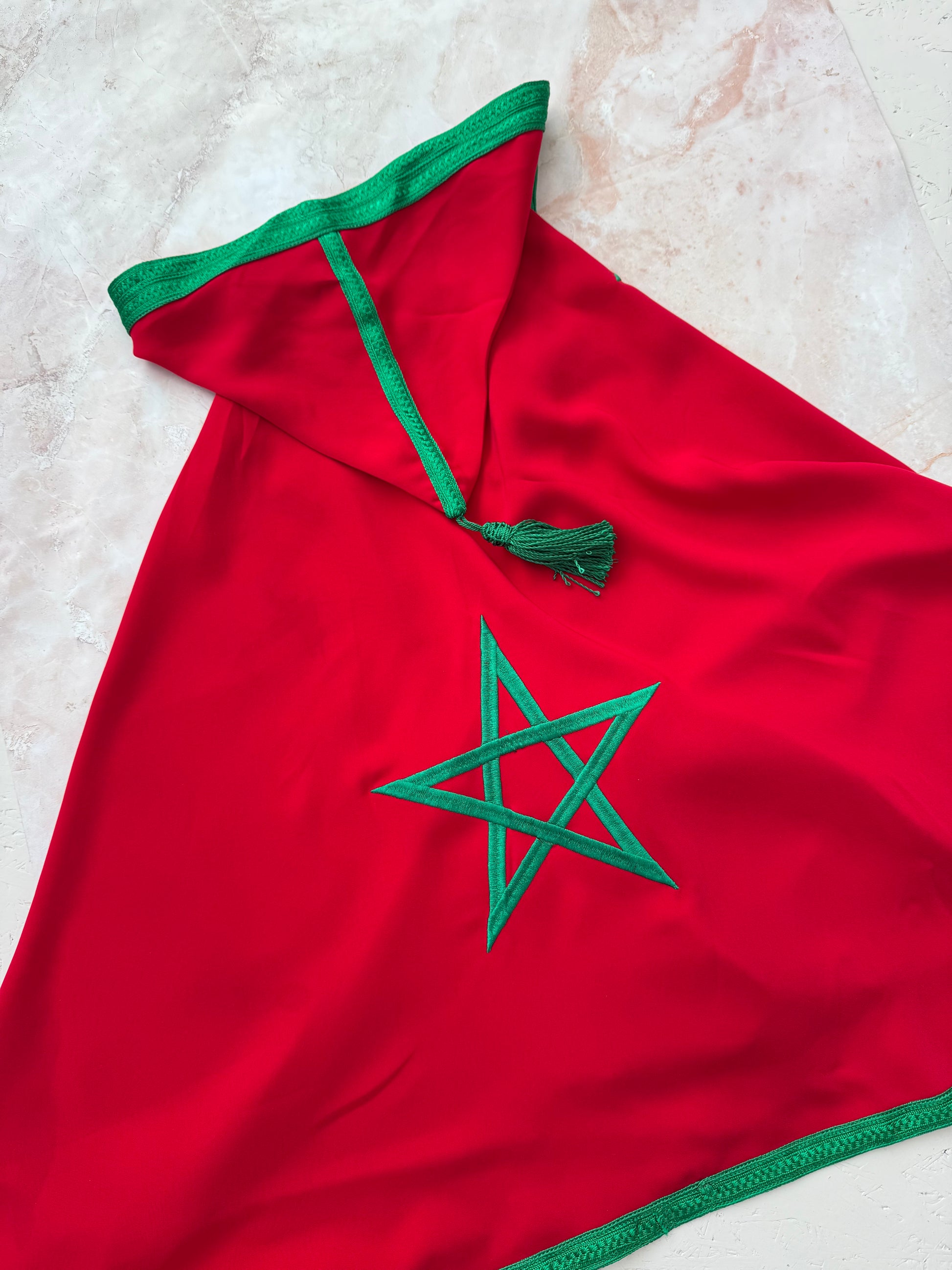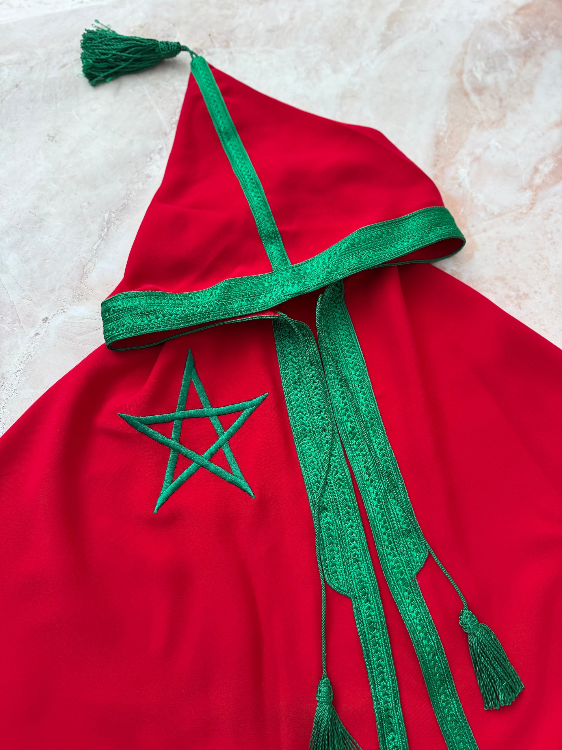 Gemaakt van een mooie, soepele dieprode stof en afgewerkt met luxe groene sfifa en de Marokkaanse ster.